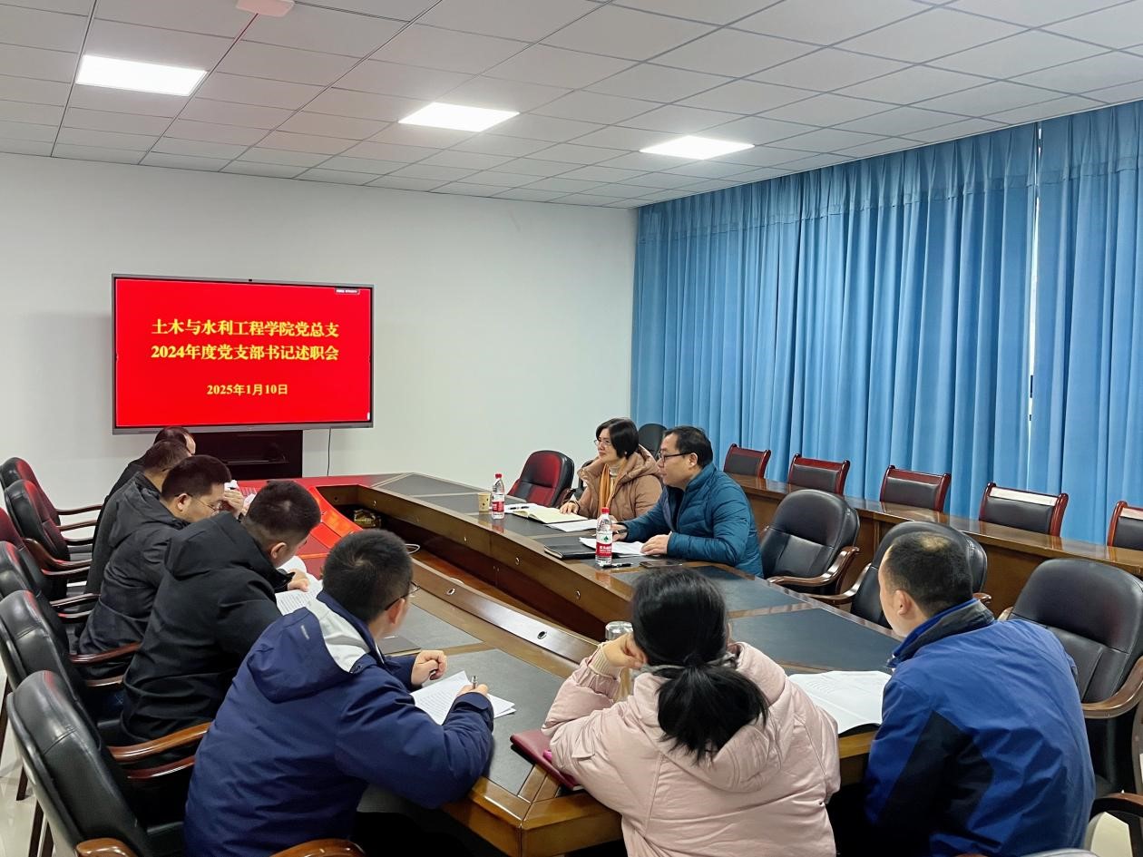1月10日,土木与水利工程学院党总支在知行楼M347会议室召开2024年度党支部书记述职会。学院所有党支部书记参加会议,学校副处级组织员吴华英列席。学院党总支书记肖鹏主持会议。