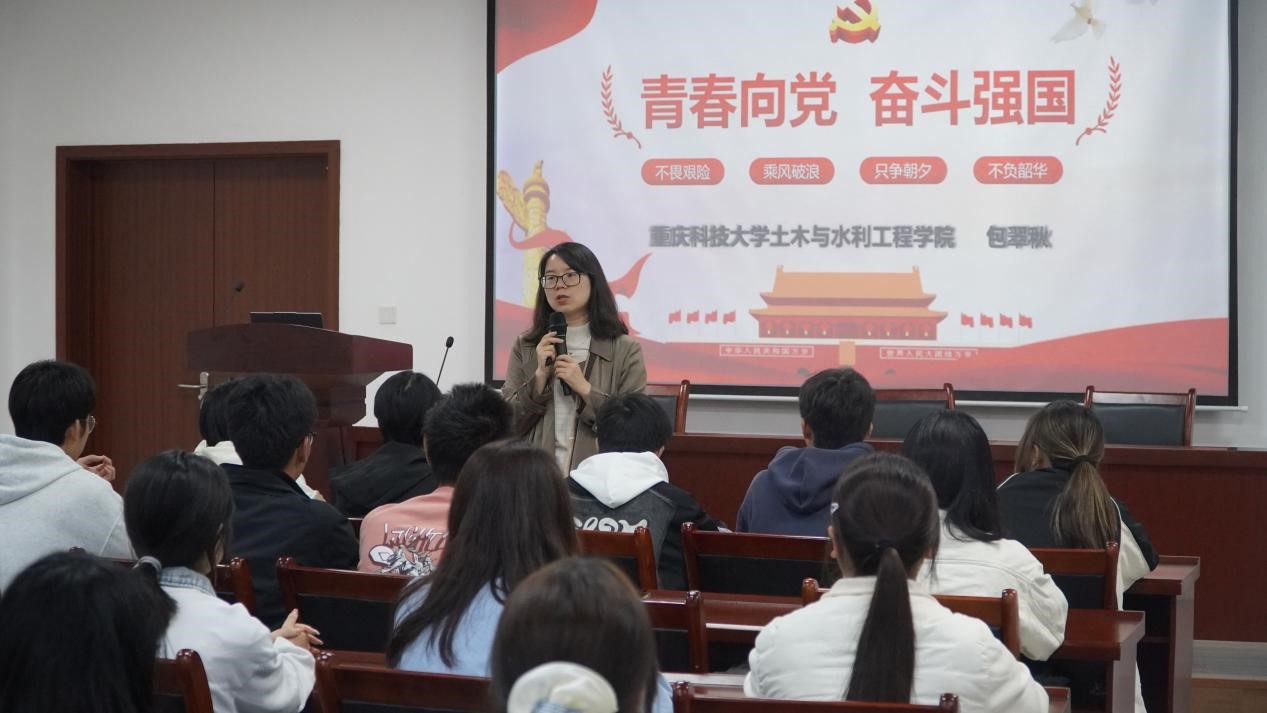 包翠秋从“理想是青春的灯塔”展开,结合英烈事迹与时代案例,号召青年学子要深刻领悟“两个确立”的决定性意义,增强“四个意识”、坚定“四个自信”、做到“两个维护”,将个人理想融入党和国家事业发展大局,与党和国家发展同心同向同行,要“深学、笃信、力行”,向党看齐,矢志报国。聚焦土木与水利工程学科的时代使命,希望同学们立足专业实际,在课堂上深耕理论知识,在实验室里钻研技术创新,在实习实践中积累工程经验,以“踏实躬行”的态度锤炼过硬本领,在前国家基础设施建设、民生工程等领域贡献青年力量。