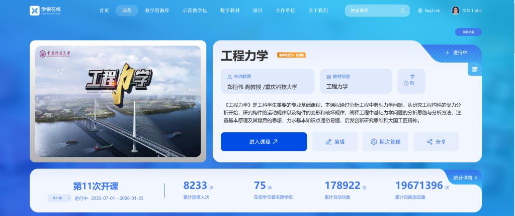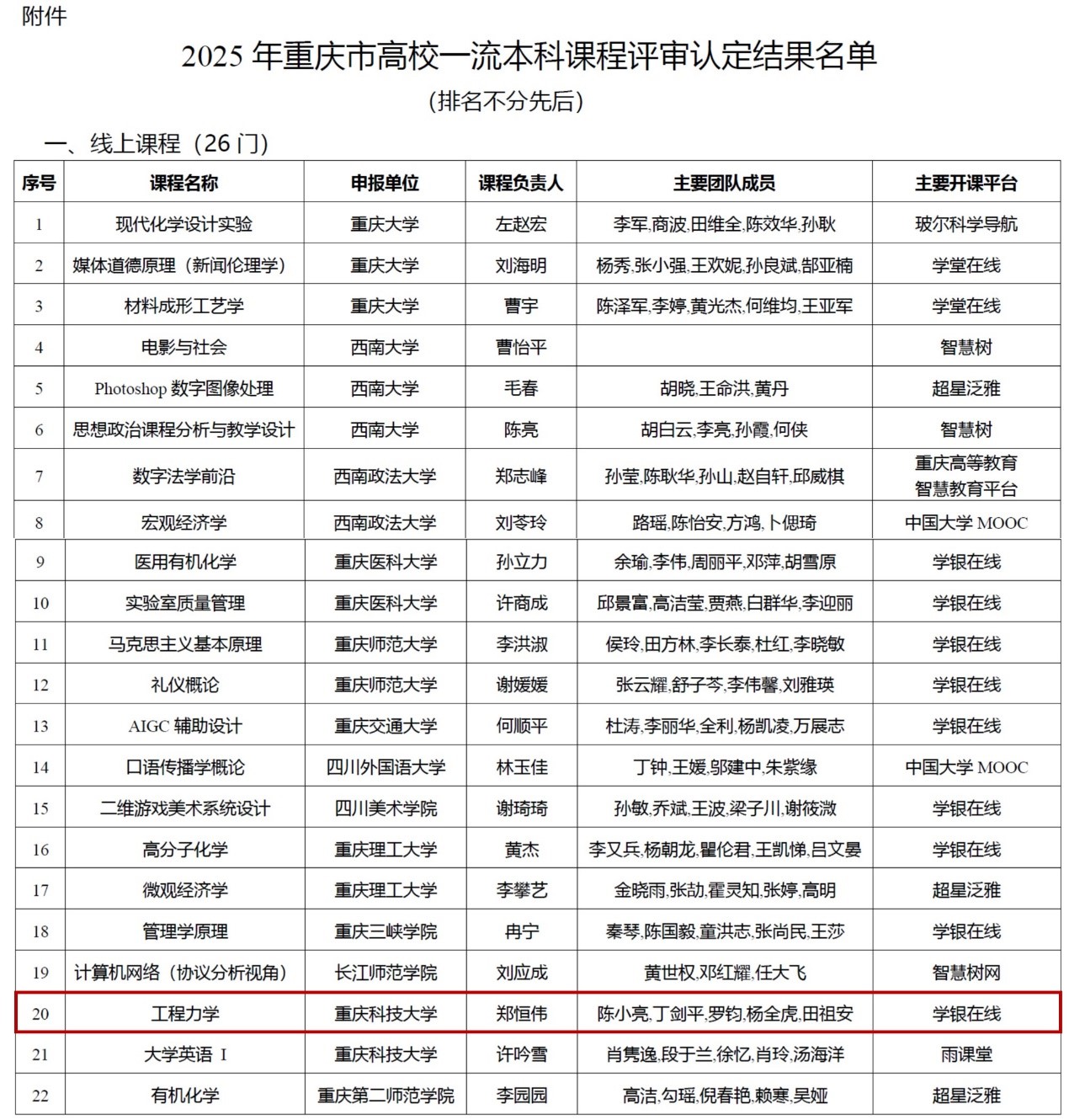 近日,教育部与重庆市教育委员会相继公布第三批国家级一流本科课程及2025年重庆市高校一流本科课程认定结果。我院《工程力学》课程获批“国家级线上线下混合式一流本科课程”,并同时获评“重庆市线上一流本科课程”。这标志着我院在课程建设与教育教学改革方面取得里程碑式进展。