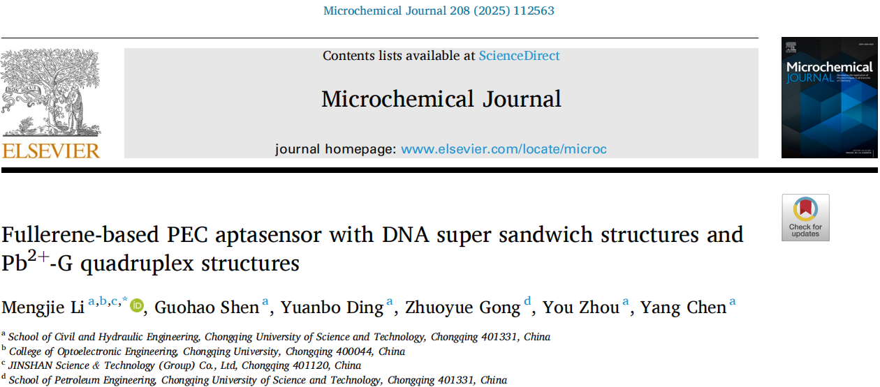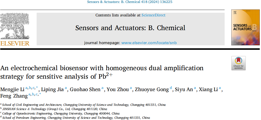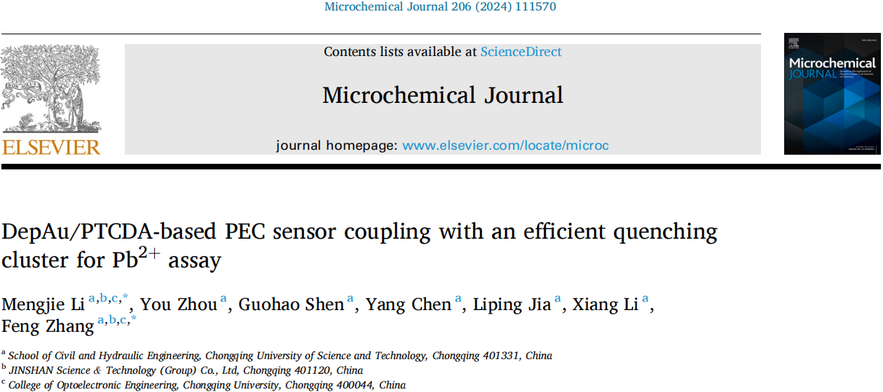 近日,分析化学与传感器技术领域的著名期刊《Sensors and Actuators: B. Chemical》(影响因子:8.0,中科院一区TOP期刊)和《Microchemical Journal》(影响因子:4.9,中科院二区期刊),相继发表了我院给排水科学与工程专业教师李孟洁博士在重金属离子检测领域的研究成果:“An electrochemical biosensor with homogeneous dual amplification strategy for sensitive analysis of Pb2+”,“Fullerene-based PEC aptasensor with DNA super sandwich structures and Pb2+-G quadruplex structures”和“DepAu/PTCDA-based PEC sensor coupling with an efficient quenching cluster for Pb2+assay”。重庆科技大学土木与水利工程学院为第一单位,李孟洁博士为第一作者,张丰博士为通讯作者。