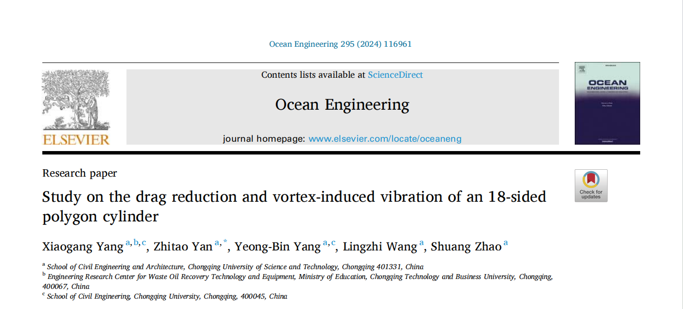 近期,工程技术、海洋工程与土木工程领域权威知名期刊《Ocean Engineering》(影响因子:4.6,中科院二区TOP期刊)发表了我院输变电工程防灾减灾团队的研究成果:“Study on the drag reduction and vortex-induced vibration of an 18-sided polygon cylinder”。重庆科技大学土木与水利工程学院为第一单位,杨小刚博士后为上述论文的第一作者,晏致涛教授为通讯作者。