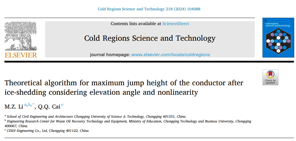 近期,工程技术领域权威知名期刊《Cold Regions Science and Technology》(影响因子:3.8,中科院二区期刊)发表了我院输变电工程团队李孟珠博士后在输电线路脱冰振动监测领域的合作研究成果:“Theoretical algorithm for maximum jump height of the conductor after ice-shedding considering elevation angle and nonlinearity”。重庆科技大学土木与水利工程学院为第一单位,李孟珠博士后为第一作者。