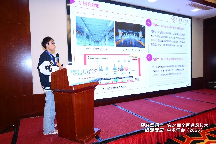 我院人工环境工程2024级研究生成云锋参会,与业界同行围绕建筑通风技术展开深入交流,并在“工业通风与除尘”专题论坛中作了题为“某地下空间咬合式车库风口布置对污染物浓度分布影响的数值模拟分析”交流报告,分享了其对该车库通风与污染物控制研究的相关见解。